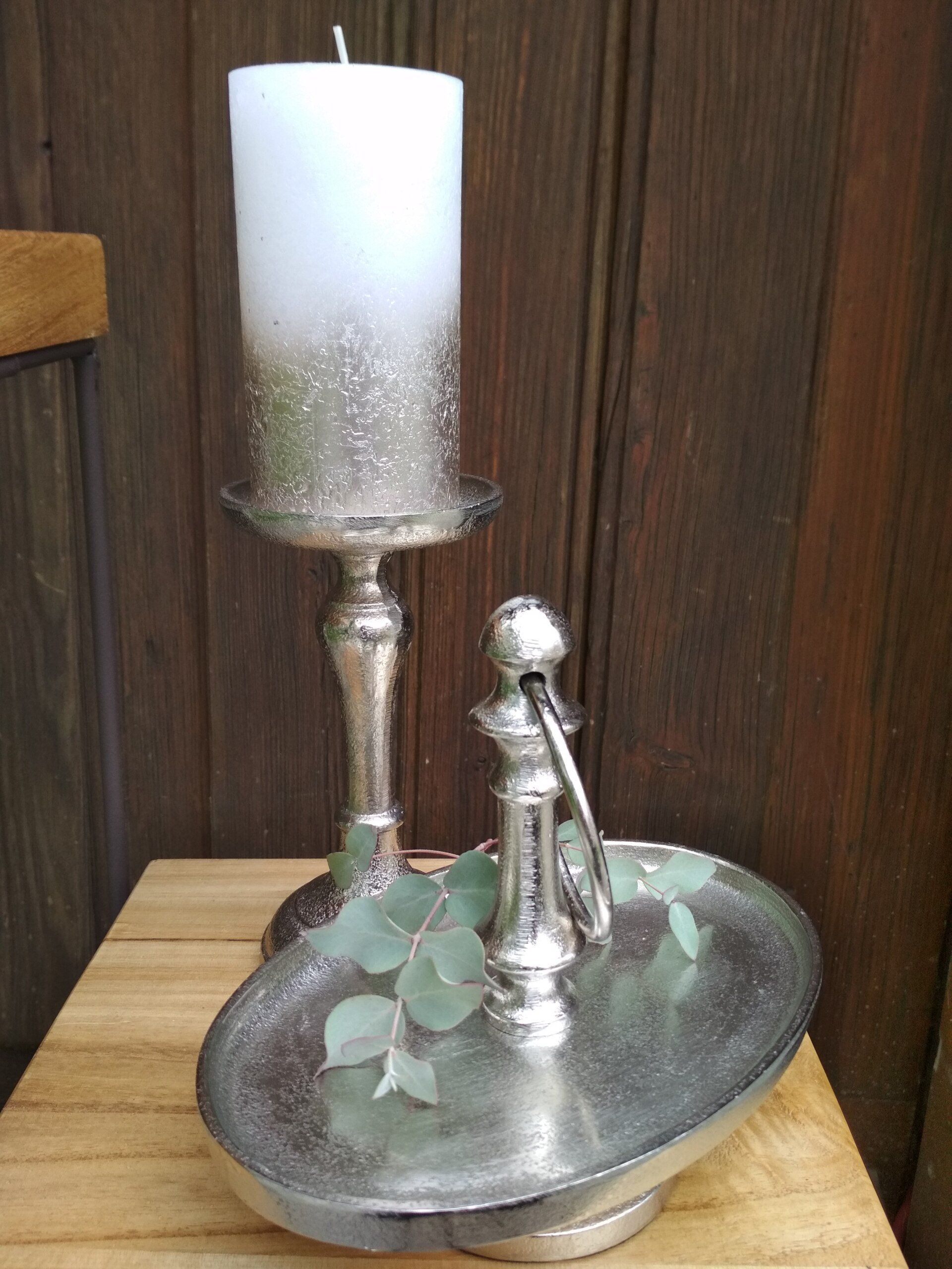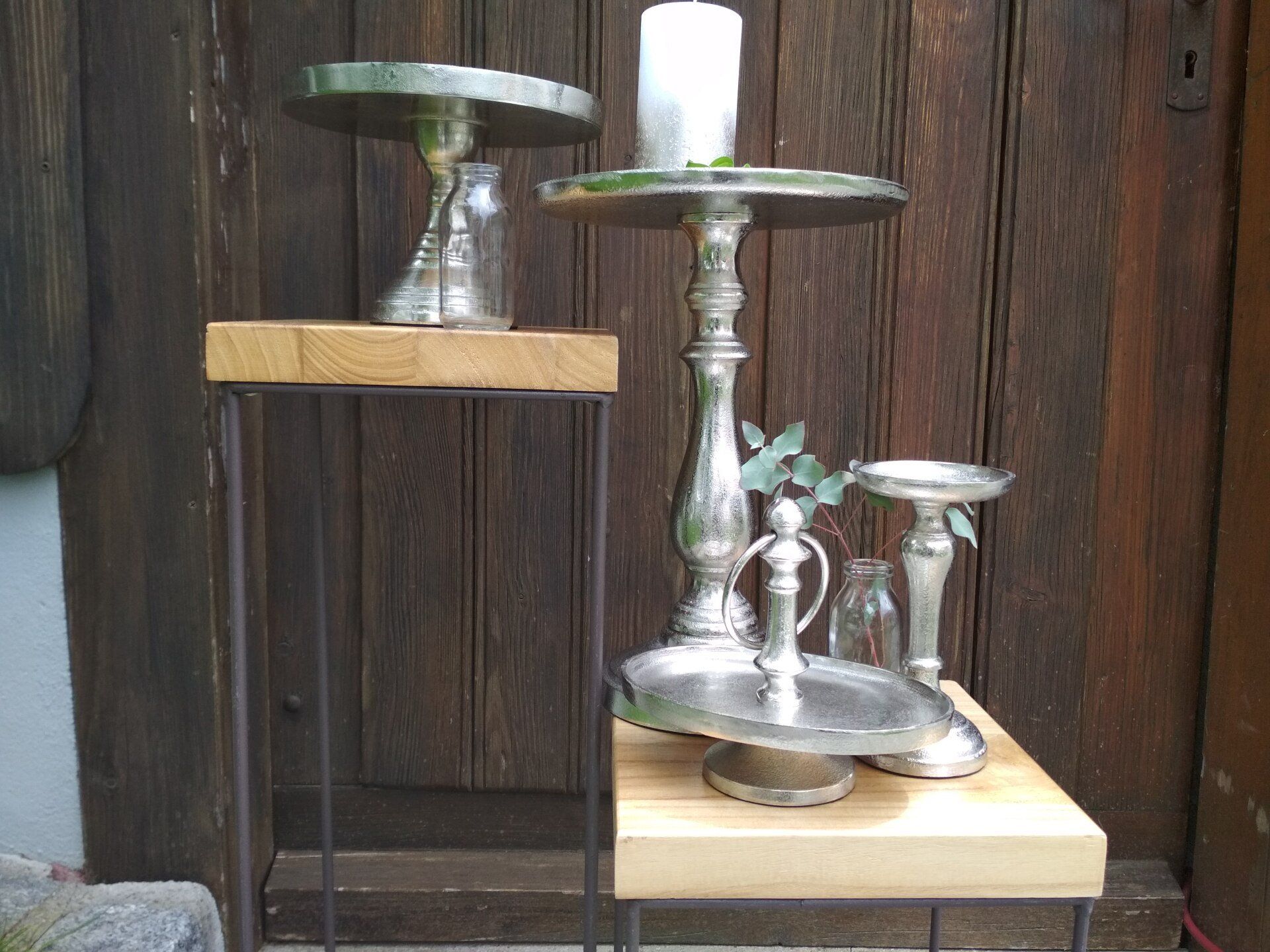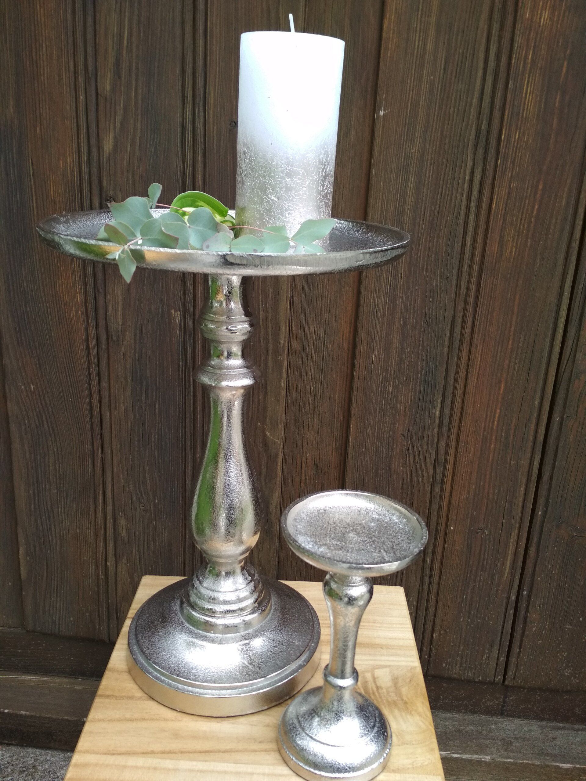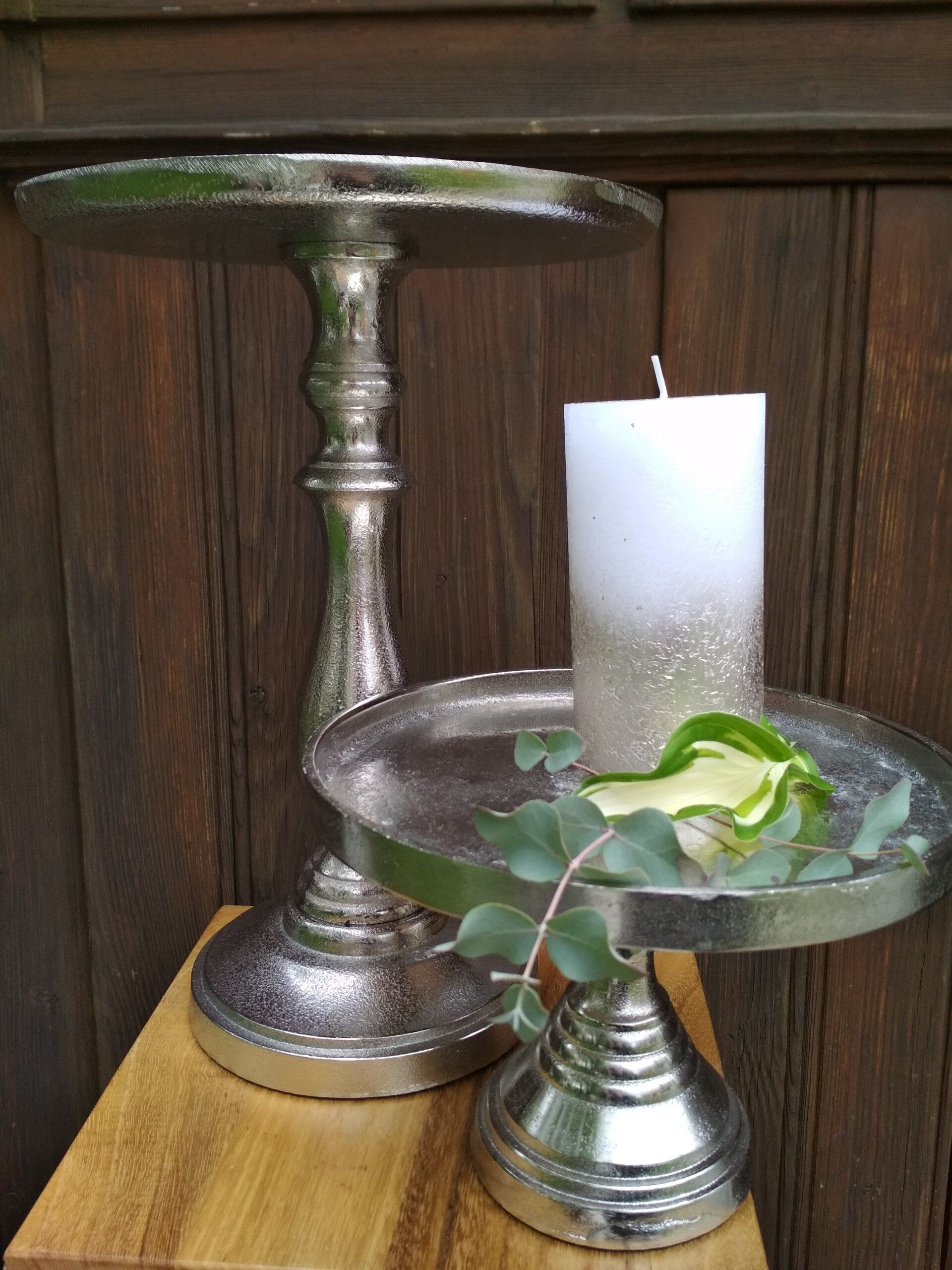 - hochwertige Alugussgefäße in silber auf Fuß, Kerzenständer,….